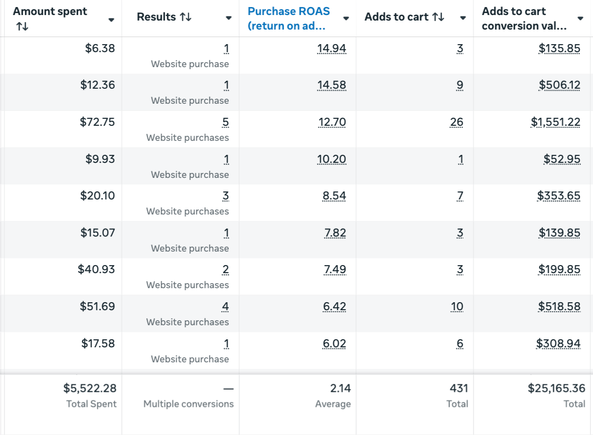 5–14x returns across multiple ad sets